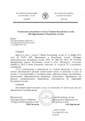 О внесении изменения в статью 3 Закона Республики Алтай "Об образовании в Республике Алтай" : Закон Республики Алтай от 18.12.2015 № 82-РЗ. - Электронные текстовые данные (1 файл). -(Москва: ГлавНИВЦ УДП РФ , 2018). - Режим доступа: интернет-портал Президентской библиотеки. Загл. с титульной страницы. Электронная версия:Закон Республики Алтай от 18.12.2015 № 82-РЗ "О внесении изменения в статью 3 Закона Республики Алтай "Об образовании в Республике Алтай".