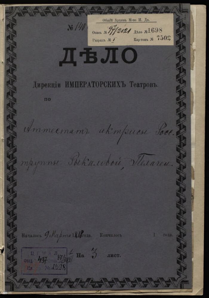 Аттестат актрисы российской труппы Пелагеи Рыкаловой