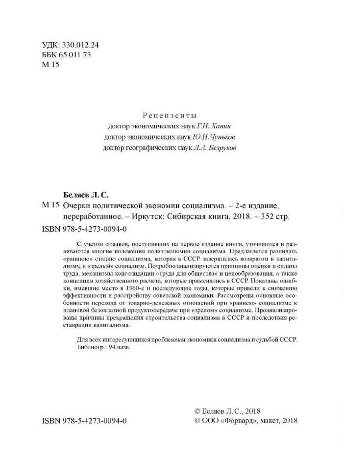 Очерки политической экономии социализма / Беляев Л. С. - 2-е издание, переработанное. -Иркутск : Сибирская книга, 2018. -351 с.. - Библиография: с. 257-263 (94 названия). . -500 экз. -ISBN 978-5-4273-0094-0
