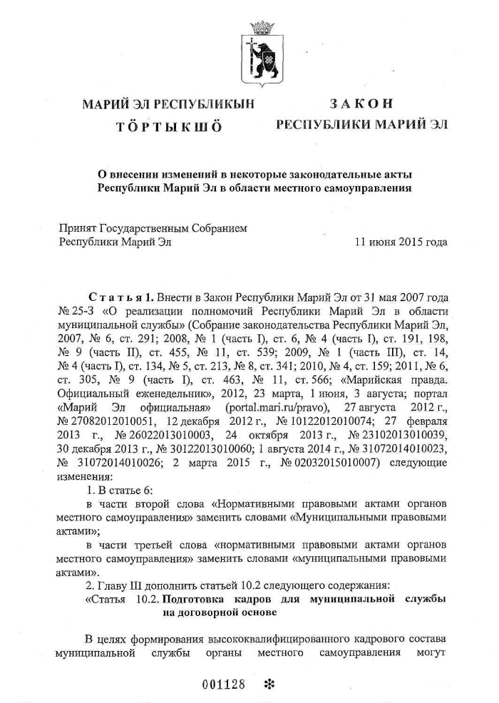 О внесении изменений в некоторые законодательные акты Республики Марий Эл в области местного самоуправления : Закон Республики Марий Эл от 17.06.2015 № 28-З. - Электронные текстовые данные (14 файла). -(Москва: ГлавНИВЦ УДП РФ , 2018). - Режим доступа: интернет-портал Президентской библиотеки. Загл. с титульной страницы. Электронная версия:Закон Республики Марий Эл от 17.06.2015 № 28-З "О внесении изменений в некоторые законодательные акты Республики Марий Эл в области местного самоуправления".