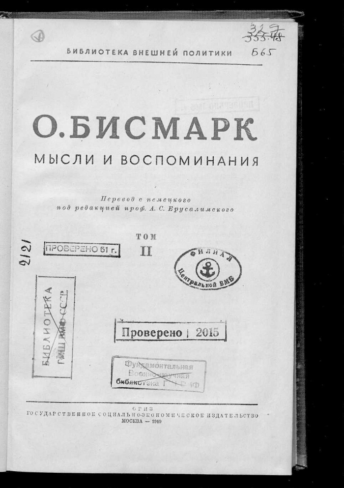 Автор Бисмарк О. Описание Бисмарк, О. Мысли и воспоминания Т. 2. - ОГИЗ Гос. соц.-экон. изд-во, 1940. -288 с.. -На обл.: ОГИЗ - Соцэкгиз.Экз.: с рукоп. помет. . 1. Власть (коллекция). Источник электронной копии: ПБМесто хранения оригинала: ЦВМБ Издательство ОГИЗ Гос. соц.-экон. изд-во