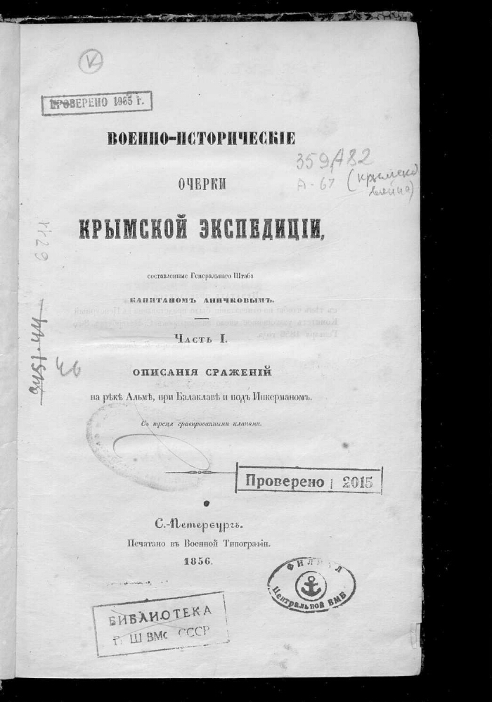 Ч. 1: Описание сражений на реке Альме при Балаклаве и под Инкерманом : С 3 грав. план. - Воен. тип., 1856. -[3], 107 с., 3 л. пл. : табл.. - Экз.: без обл.
