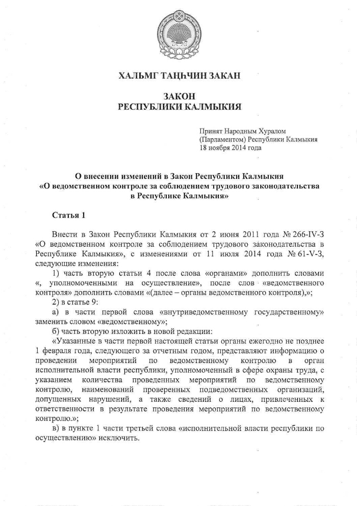 О внесении изменений в Закон Республики Калмыкия "О ведомственном контроле за соблюдением трудового законодательства в Республике Калмыкия" : Закон Республики Калмыкия от 18.11.2014 № 87-V-З. - Электронные текстовые данные (2 файла). -(Москва: ГлавНИВЦ УДП РФ , 2018). - Режим доступа: интернет-портал Президентской библиотеки. Загл. с титульной страницы. Электронная версия:Закон Республики Калмыкия от 18.11.2014 № 87-V-З "О внесении изменений в Закон Республики Калмыкия "О ведомственном контроле за соблюдением трудового законодательства в Республике Калмыкия".