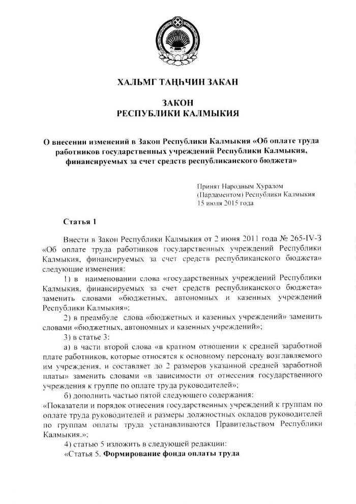 О внесении изменений в Закон Республики Калмыкия "Об оплате труда работников государственных учреждений Республики Калмыкия, финансируемых за счет средств республиканского бюджета" : Закон Республики Калмыкия от 17.07.2015 № 134-V-3. - Электронные текстовые данные (2 файла). -(Москва: ГлавНИВЦ УДП РФ , 2018). - Режим доступа: интернет-портал Президентской библиотеки. Загл. с титульной страницы. Электронная версия:Закон Республики Калмыкия от 17.07.2015 № 134-V-3 "О внесении изменений в Закон Республики Калмыкия "Об оплате труда работников государственных учреждений Республики Калмыкия, финансируемых за счет средств республиканского бюджета".