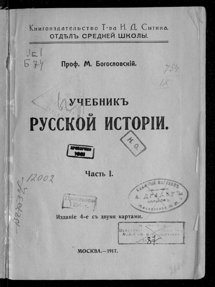 Учебник русской истории / Проф. М. Богословский. - 4-е изд. с 2-мя карт. -Москва : Кн-во Т-ва И.Д. Сытина. Отд. сред. шк., [1917-1918]. -