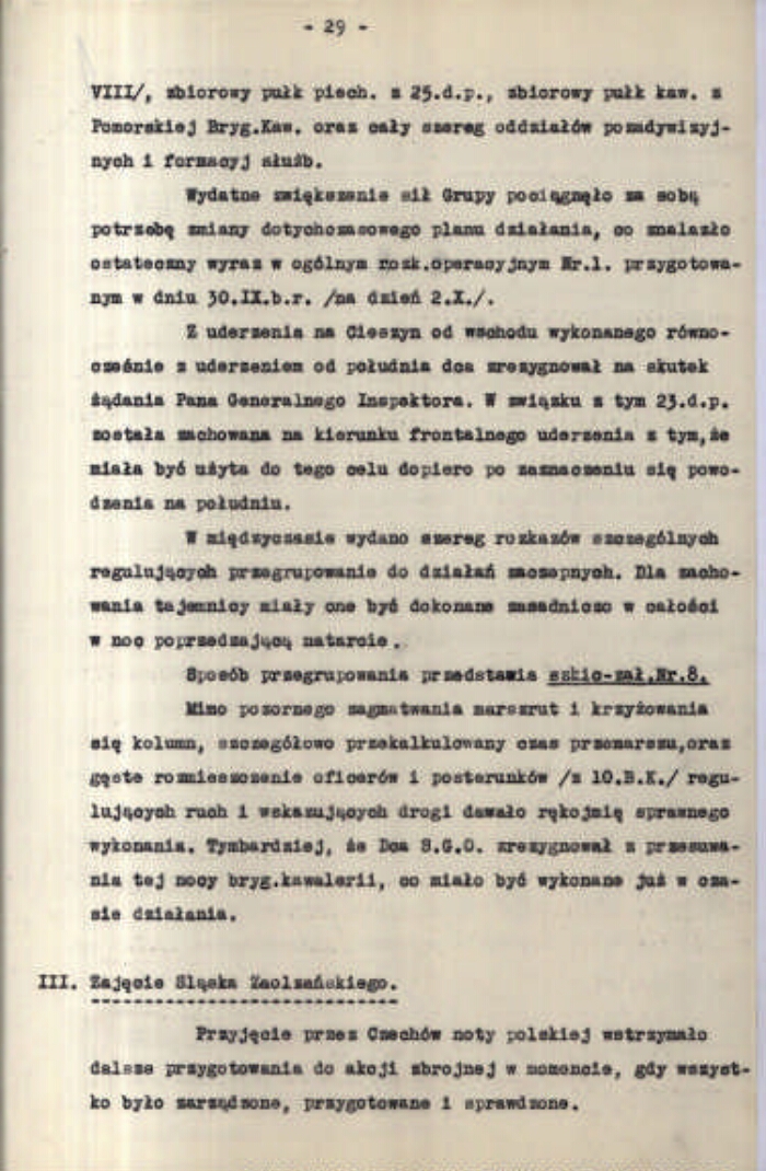 | Заголовок | Из отчета командующего отдельной оперативной группой "Силезия" В. Бортновского - о подготовке наступательной операции, захвате Заользья (Тешинской обл.) и обучении войк |