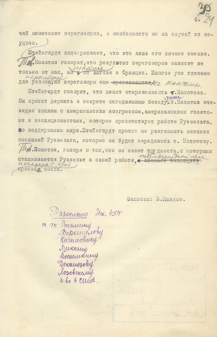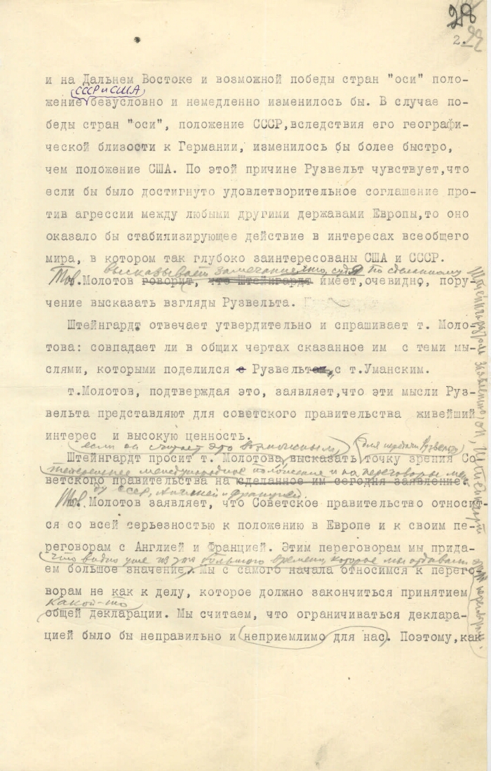 | Заголовок | Из дневника наркома иностранных дел СССР В. М. Молотова – запись беседы с послом США в СССР Л. Штейнгардтом о взглядах президента США Ф. Рузвельта на международное положение и об отношении правительства СССР к переговорам с Великобританией и Францией |