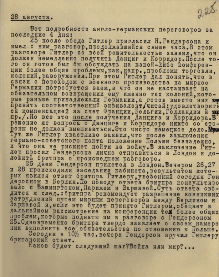 | Заголовок | Из дневника полпреда СССР в Великобритании И. М. Майского – о подробностях англо-германских переговоров после заключения советско-германского договора о ненападении |