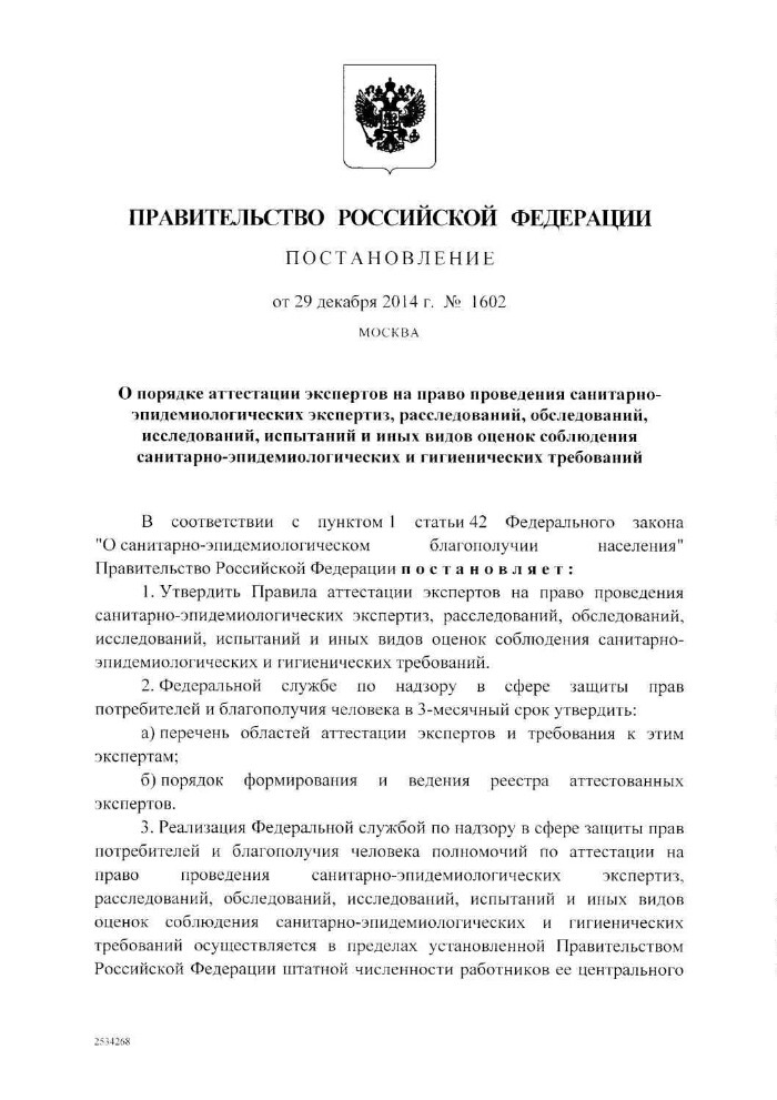 О порядке аттестации экспертов на право проведения санитарно-эпидемиологических экспертиз, расследований, обследований, исследований, испытаний и иных видов оценок соблюдения санитарно-эпидемиологических и гигиенических требований : Постановление Правительства Российской Федерации от 29.12.2014 № 1602. - Электронные текстовые данные (7 файлов). -(Москва: ГлавНИВЦ УДП РФ , 2018). - Режим доступа: интернет-портал Президентской библиотеки. Загл. с титульной страницы. Электронная версия: Постановление Правительства Российской Федерации от 29.12.2014 № 1602 "О порядке аттестации экспертов на право проведения санитарно-эпидемиологических экспертиз, расследований, обследований, исследований, испытаний и иных видов оценок соблюдения санитарно-эпидемиологических и гигиенических требований".