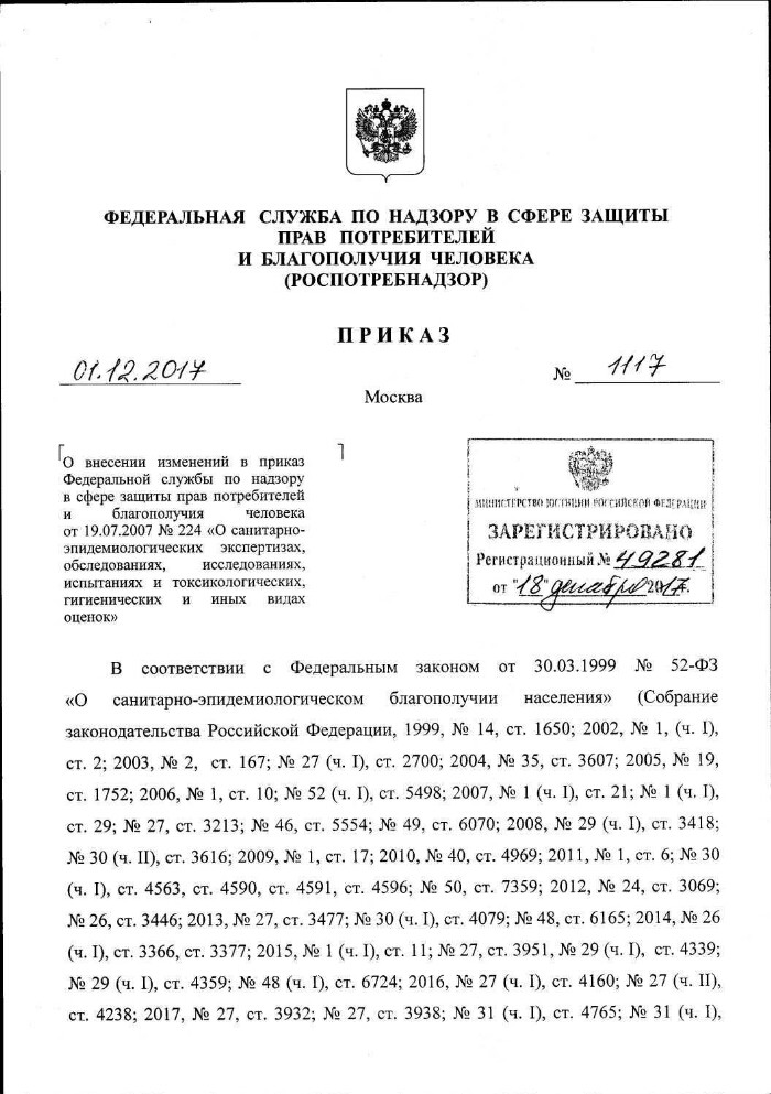 О внесении изменений в приказ Федеральной службы по надзору в сфере защиты прав потребителей и благополучия человека от 19.07.2007 № 224 "О санитарно-эпидемиологических экспертизах, обследованиях, исследованиях, испытаниях и токсикологических, гигиенических и иных видах оценок" : Приказ Федеральной службы по надзору в сфере защиты прав потребителей и благополучия человека от 01.12.2017 № 1117. - Электронные текстовые данные (4 файла). -(Москва: ГлавНИВЦ УДП РФ , 2018). - Режим доступа: интернет-портал Президентской библиотеки. Загл. с титульной страницы. Электронная версия: Приказ Федеральной службы по надзору в сфере защиты прав потребителей и благополучия человека от 01.12.2017 № 1117 "О внесении изменений в приказ Федеральной службы по надзору в сфере защиты прав потребителей и благополучия человека от 19.07.2007 № 224 "О санитарно-эпидемиологических экспертизах, обследованиях, исследованиях, испытаниях и токсикологических, гигиенических и иных видах оценок".