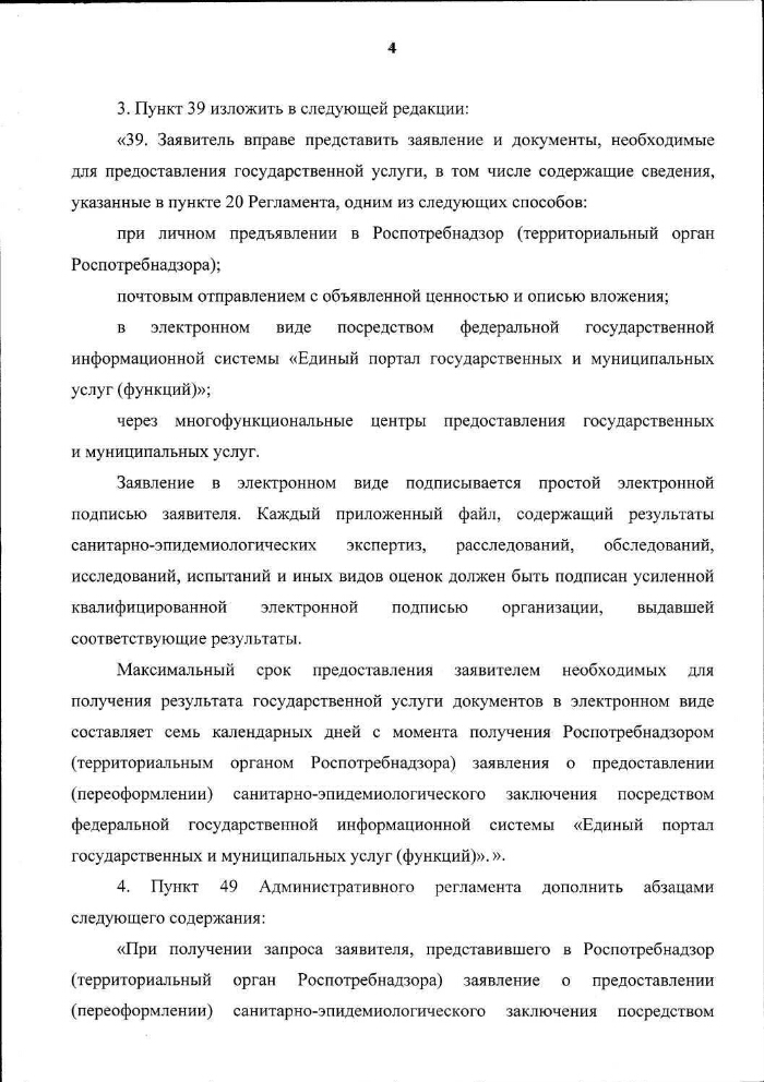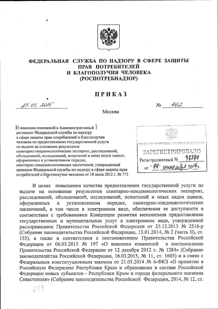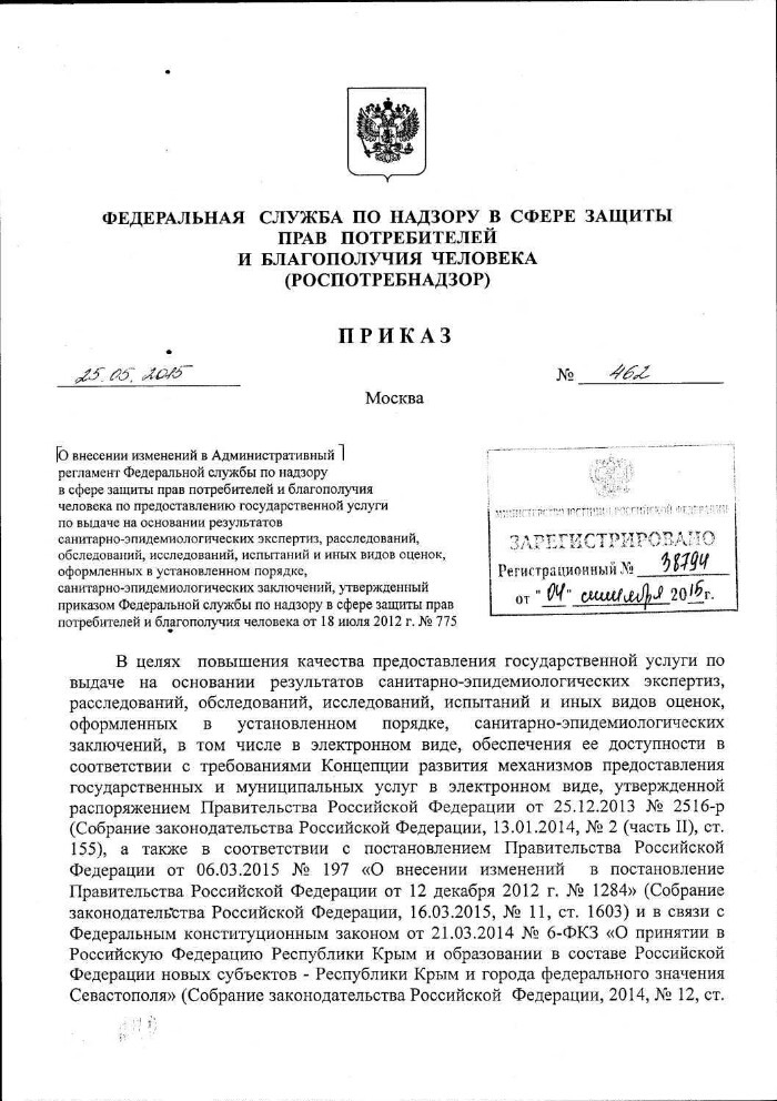 О внесении изменений в Административный регламент Федеральной службы по надзору в сфере защиты прав потребителей и благополучия человека по предоставлению государственной услуги по выдаче на основании результатов санитарно-эпидемиологических экспертиз, расследований, обследований, исследований, испытаний и иных видов оценок, оформленных в установленном порядке, санитарно-эпидемиологических заключений, утвержденный приказом Федеральной службы по надзору в сфере защиты прав потребителей и благополучия человека от 18 июля 2012 г. № 775 : Приказ Федеральной службы по надзору в сфере защиты прав потребителей и благополучия человека от 25.05.2015 № 462. - Электронные текстовые данные (9 файлов). -(Москва: ГлавНИВЦ УДП РФ , 2018). - Режим доступа: интернет-портал Президентской библиотеки. Загл. с титульной страницы. Электронная версия: Приказ Федеральной службы по надзору в сфере защиты прав потребителей и благополучия человека от 25.05.2015 № 462 "О внесении изменений в Административный регламент Федеральной службы по надзору в сфере защиты прав потребителей и благополучия человека по предоставлению государственной услуги по выдаче на основании результатов санитарно-эпидемиологических экспертиз, расследований, обследований, исследований, испытаний и иных видов оценок, оформленных в установленном порядке, санитарно-эпидемиологических заключений, утвержденный приказом Федеральной службы по надзору в сфере защиты прав потребителей и благополучия человека от 18 июля 2012 г. № 775".