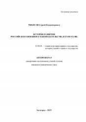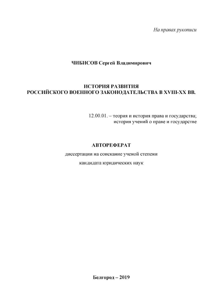 История развития Российского военного законодательства в XVIII - XX вв. : автореферат диссертации на соискание ученой степени кандидата юридических наук : специальность 12.00.01 - "Теория и история права и государства; история учений о праве и государстве" / Чибисов Сергей Владимирович ; [Место защиты: Белгородский государственный национальный исследовательский университет]. - Белгород, 2019. -23 с. ; 21. - Библиогр.: с. 22-23 (12 назв.) и в подстроч. примеч. . -100 экз.