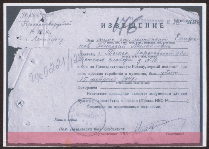 Извещение о смерти Епифанова Геннадия Михайловича составлено Красногвардейским РВК г. Ленинграда. Из текста документа: "Ваш муж ст. лейтенант Епифанов Геннадий Михайлович ... в бою за Социалистическую Родину, верный воинской присяге, проявив геройство и мужество был убит 15 февраля 1942 г. ...". - Епифанов Геннадий Михайлович (1906-1942) уроженец г. Выксы Горьковской области. Во время Великой Отечественной войны служил в звании старшего лейтенанта командиром стрелковой роты 296 стрелкового батальона 13 стрелковой дивизии. Умер от ран 16 февраля 1942 года в Ленинграде. Похоронен на Серафимовском кладбище .