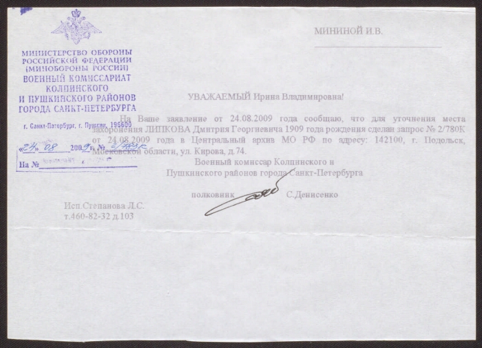 Ответ на заявление Мининой И. В. об уточнении места захоронения Липкова Дмитрия Георгиевича / Министерство обороны Российской Федерации, Военный комиссариат Колпинского и Пушкинского районов города Санкт-Петербурга. - Санкт-Петербург, 2009. -1 лист, бумага. - Режим доступа: интернет-портал Президентской библиотеки. Справка представлена на листе бумаги, компьютерный набор текста. На бланке штамп фиолетовыми чернилами: Министерство обороны Российской Федерации, Военный комиссариат Колпинского и Пушкинского районов города Санкт-Петербурга. В электронном фонде Президентской библиотеки представлены материалы брата Липкова Д. Г. Липкова Михаила Георгиевича. Электронная версия (2 файла, JPEG : 2,1 МБ). Копирование пользователями не разрешается. Ответ Военного комиссариата Колпинского и Пушкинского районов города Санкт-Петербурга Министерства обороны Российской Федерации № 2/783К на заявление Мининой Ирины Владимировны об уточнении места захоронения Липкова Дмитрия Георгиевича. Ответ составлен 24 августа 2009 г. Из текста: "... На Ваше заявление от 24.08.2009 г. сообщаю, что для уточнения места захоронения Липкова Дмитрия Георгиевича 1909 года рождения сделан запрос № 2/780К от 24.08.2009 г. в Центральный архив МО РФ ..." В конце текста собственноручная подпись военного комиссара Колпинского и Пушкинского районов города Санкт-Петербурга полковника С. Денисенко. - Дмитрий Георгиевич Липков (1909-1942) - уроженец г. Выкса Горьковской области. Во время Великой Отечественной войны служил в звании старшего лейтенанта командиром взвода 79 отдельного саперного батальона 56 стрелковой дивизии. Погиб в бою 10 августа 1942 года. Похоронен в г. Колпино Ленинградской области