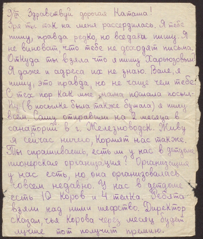 Письмо Бориса Зернова к Наталии Пржиборовской. - [Станица Келершесская (Краснодарский край), 1943-1945]. -1 лист (бумага). - Режим доступа: интернет-портал Президентской библиотеки. Написано от руки, фиолетовые чернила, текст письма на обеих сторонах листа. Электронная версия (2 файла, JPEG : 4,1 МБ). Копирование пользователями не разрешается. Письмо Бориса Зернова к Наталии Пржиборовской, находящейся в эвакуации. Без адреса. Перед текстом дата: 9 марта. Текст начинается словами: "Здравствуй дорогая Наташа! Зря ты так на меня рассердилась. Я тебе пишу, правда редко, но вседаки пишу ..." (сохранена авторская орфография и пунктуация). Письмо написано на пожелтевшем тетрадном листке в клетку. - Борис Зернов - сосед по квартире Наталии Пржиборовской в Ленинграде на 2-й Красноармейской улице. Весной 1942 г. был эвакуирован в Краснодарский край. - Наталия Евгеньевна Пржиборовская (1930-), после удочерения в семье дяди - Наталия Донатовна Лузанова, в замужестве Наталия Донатовна Михайлова