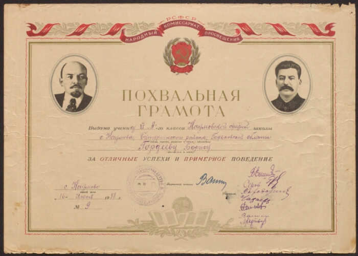 Похвальная грамота выдана ученику VI "А" класса Наумовской средней школы с. Наумово Бутурлинского района Горьковской области Гордееву Борису за отличные успехи и примерное поведение. - Гордеев Борис Федорович (1925 года рождения) - участник Великой Отечественной войны, капитан 1 ранга, кандидат военно-морских наук, Ветеран Вооруженных сил СССР. Военную службу начал в 1942 году – курсантом Высшего военно-морского училища им. М. В. Фрунзе (училище было эвакуировано из Ленинграда в Баку и объединено с Каспийским Высшим военно-морским училищем). Принимал участие в строительстве оборонительных укреплений на Кавказском фронте, в патрулировании г. Баку, в боевых действиях на крейсере «Молотов», в освобождении от мин фарватера «Одесса-Николаев». С 1946 года, по окончании Каспийского Высшего военно-морского училища, служил на Балтийском флоте. В 1950 году окончил Высшие Специальные Офицерские классы ВМС в Ленинграде и перешел на преподавательскую работу, защитил диссертацию на соискание степени кандидата военно-морских наук. После увольнения со службы в 1979 году и до 1995 года работал старшим научным сотрудником в Военно-Морской Академии. Имеет награды: Орден Отечественной войны II степени, медали «За боевые заслуги», «За участие в героической обороне Кавказа», «За Победу над Германией в Великой Отечественной войне 1941—1945 гг.», «Ветеран Вооруженных сил», «За безупречную службу в Вооруженных силах СССР» I и II степени., юбилейными медалями в честь Победы в Великой Отечественной войне, дня города Ленинграда/Санкт-Петербурга, юбилеев Вооруженных сил СССР .