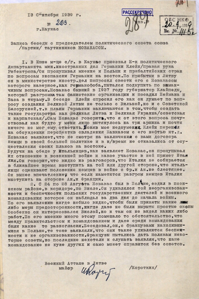 | Заголовок | Запись беседы советского военного атташе в Литве И. М. Коротких с председателем политического совета Союза таутининков Й. Навакасом о предвоенных планах Германии в отношении Литвы, Украины и Кавказа, возможном вступлении Италии в войну и беспечности польского руководства накануне нападения Германии на Польшу |