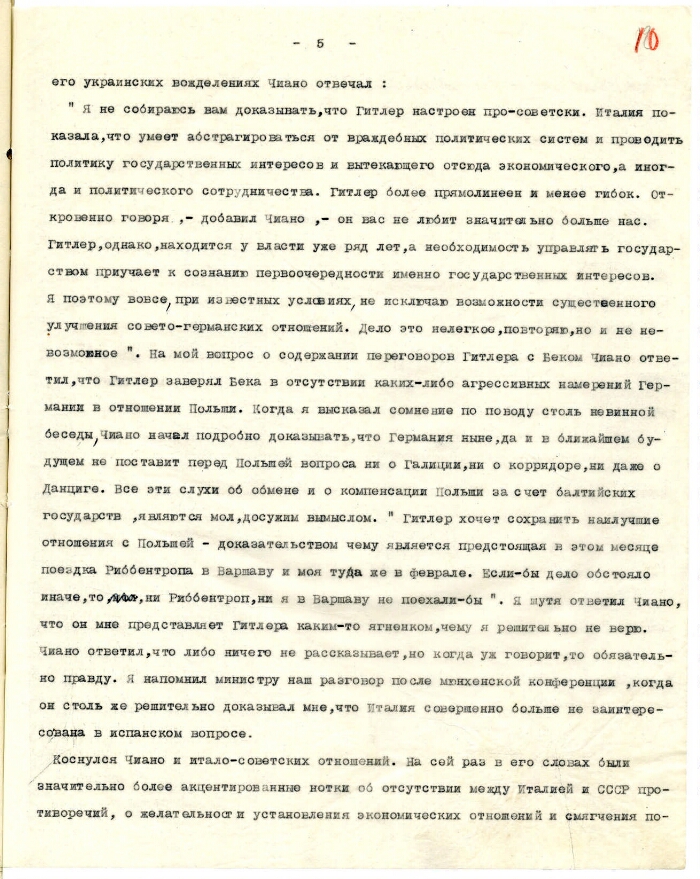 | Заголовок | Из дневника временного поверенного в делах СССР в Италии Л. Б. Гельфанда - запись беседы с министром иностранных дел Италии Г. Чиано об отсутствии в краткосрочной перспективе агрессивных замыслов Германии в отношении СССР |