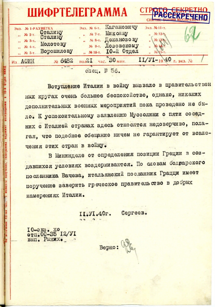 | Заголовок | Шифртелеграмма временного поверенного в делах СССР в Греции М. Г. Сергеева в НКИД СССР об обеспокоенности правительственных кругов Греции в связи с вступлением Италии в войну |