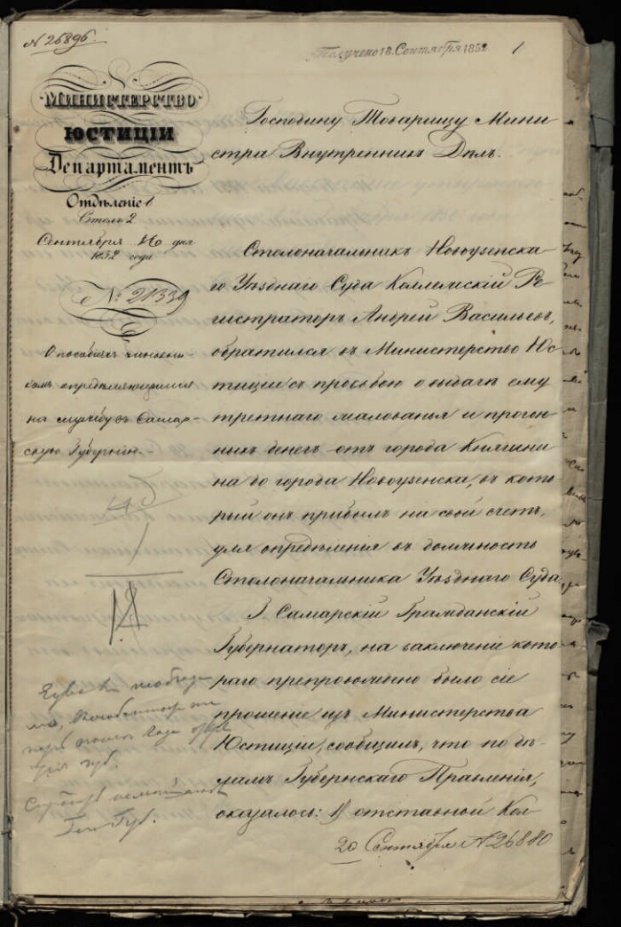| Примечания | Оригинальный заголовок дела: Дело по отношению министра юстиции о пособии чиновникам, определяющимся на службу в Самарскую губернию Рукописный текст. Чернила |