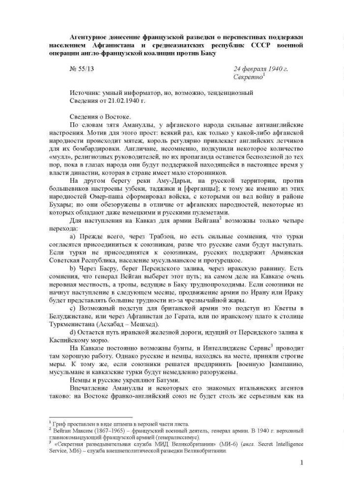 | Заголовок | Агентурное донесение французской разведки о перспективах поддержки населением Афганистана и среднеазиатских республик СССР военной операции англо-французской коалиции против Баку |