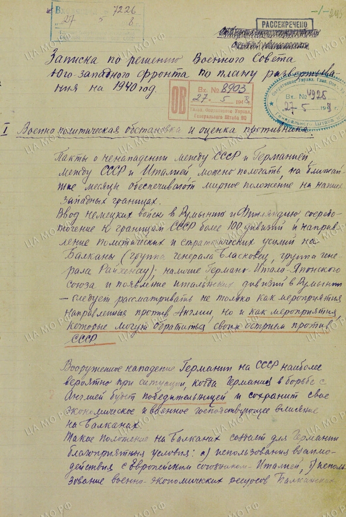 | Заголовок | Записка начальника штаба Киевского особого военного округа по решению Военного совета Юго-Западного фронта по плану оперативного развертывания на 1940 г. |