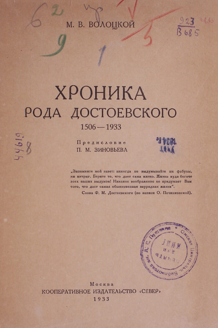 Хроника рода Достоевского : 1506-1933 / М. В. Волоцкой ; предисловие П. М. Зиновьева. - Москва : Кооперативное издательство "Север", 1933. -442, [1] с., [5] л. ил. : ил., схем. ; 21×15 см. - (Записи прошлого : воспоминания и письмапод редакцией М. Цявловского). - Библиография: "Указатель источников" (с. 431-434) и в подстрочных примечаниях.
