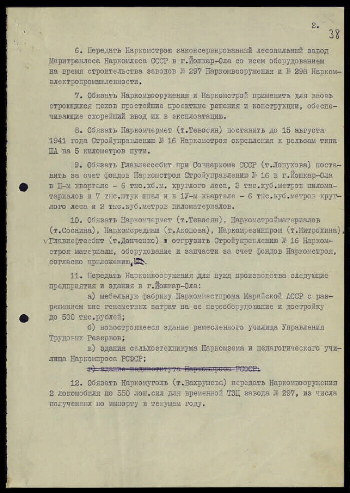 | Заголовок | Постановление ГКО № 374 сс о строительстве завода № 297 Наркомата вооружения в г. Йошкар-Оле Марийской АССР, с приложением докладных записок Александрова А. С. Вознесенскому Н. А., Косяченко Г. П. Сабурову М. З., Гинзбурга С. З. Вознесенскому Н. А. |
