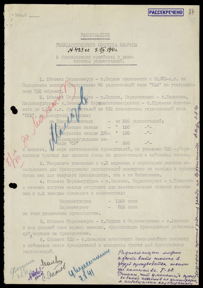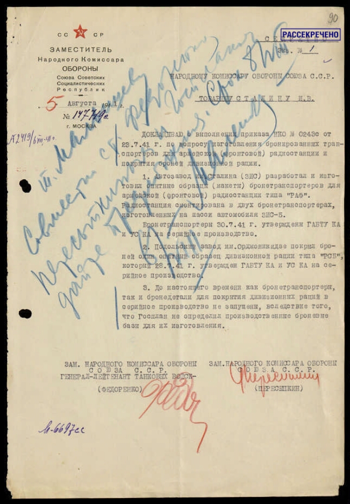 | Заголовок | Постановление ГКО СССР № 429 сс о бронировании армейских и дивизионных радиостанций, с приложением записок Малышева В. А. Маленкову Г. М., Федоренко Я. Н. и Пересыпкина И. Т. Сталину И. В. |