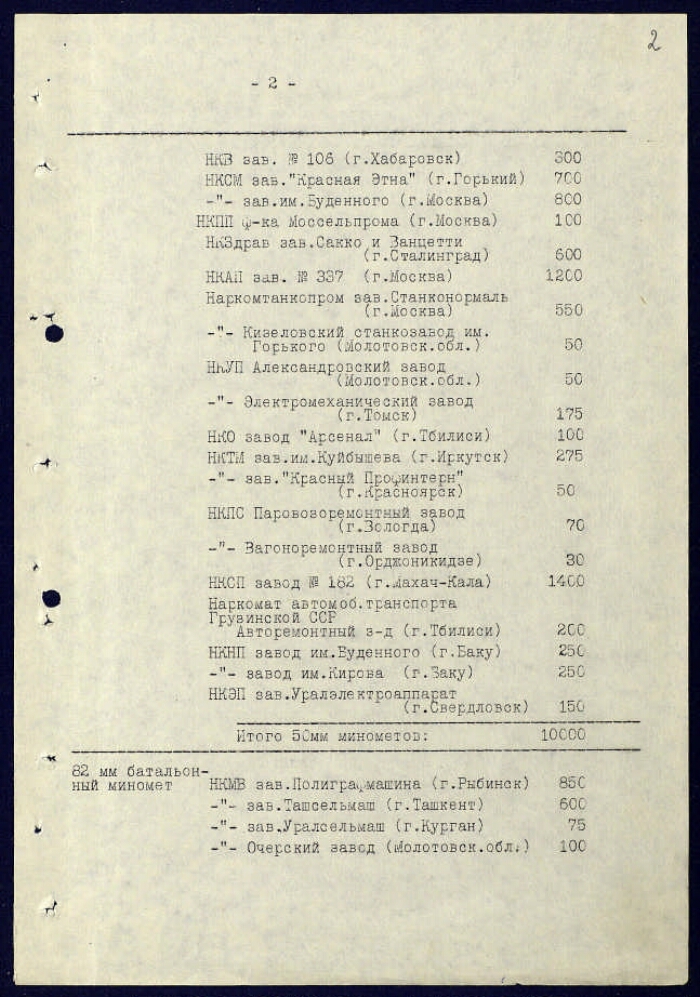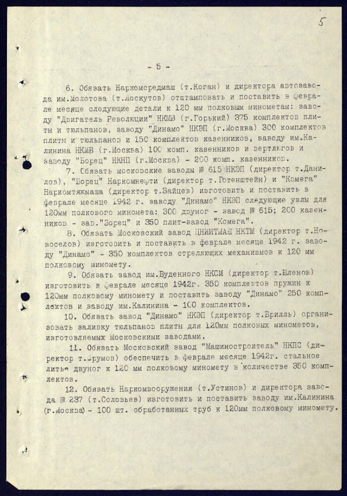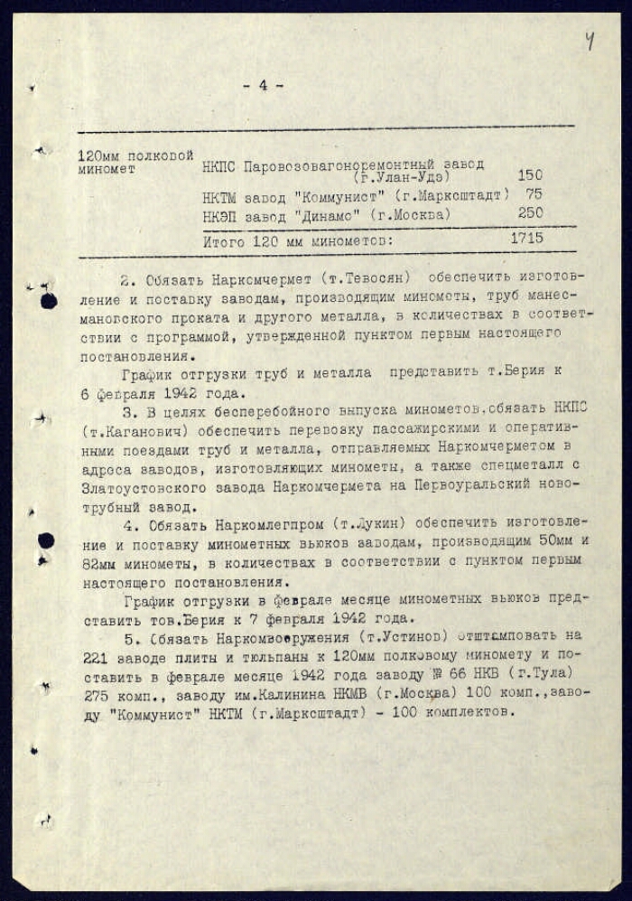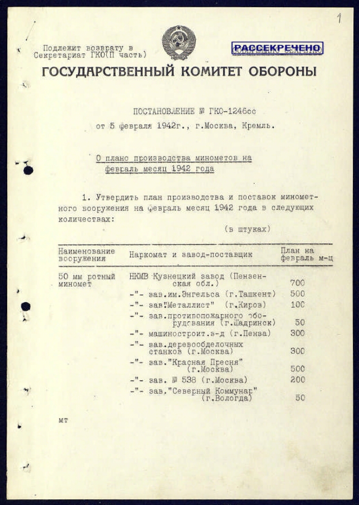 | Заголовок | Постановление ГКО СССР № 1246 сс о плане производства минометов на февраль 1942 г., с приложением записок Берии Л. П., Паршина П. И. Сталину И. В., Мамулова С. С. Суховой Е. Н., Поскребышева А. Н. Мамулову С. С. |