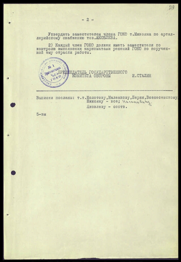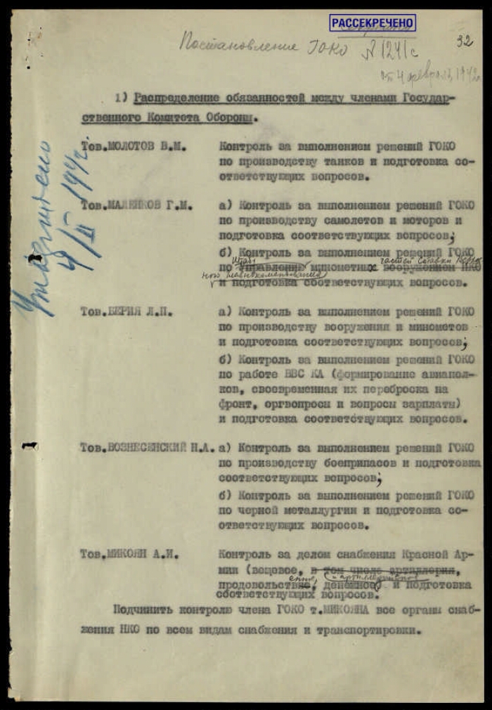 | Заголовок | Постановление ГКО СССР № 1241 с о распределении обязанностей между членами Государственного комитета обороны |
