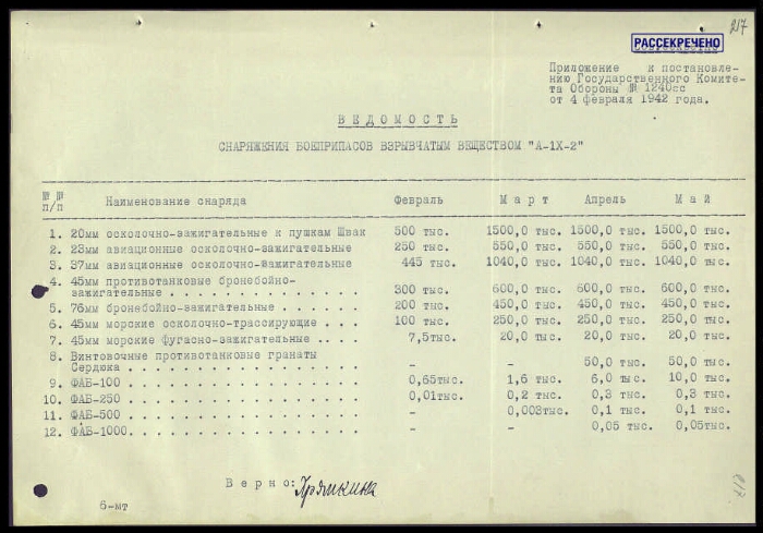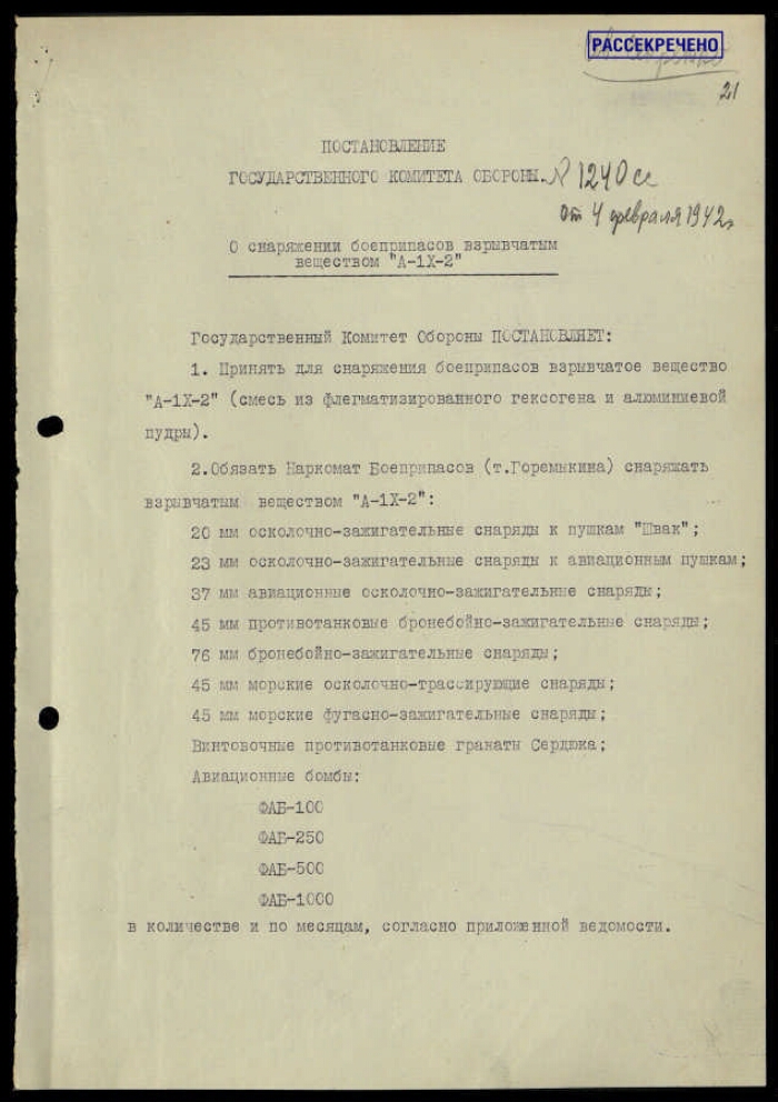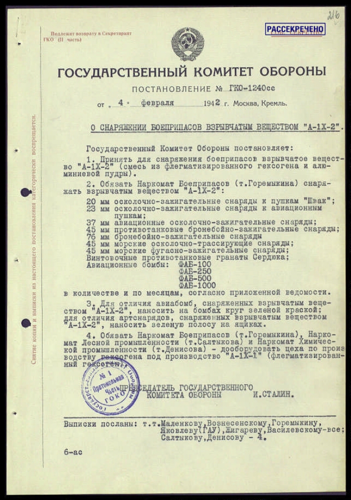 | Заголовок | Постановление ГКО СССР № 1240 сс о снаряжении боеприпасов взрывчатым веществом А-IX-2, с приложением записки Маленкова Г. М., Вознесенского Н. А. Сталину И. В. с приложением актов испытания вещества А-IX-2 |