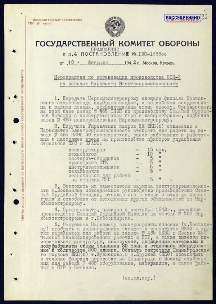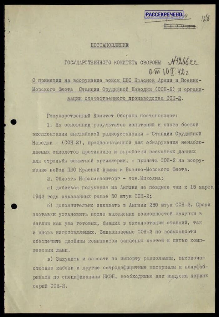 | Заголовок | Постановление ГКО СССР № 1266 сс о принятии на вооружение войск ПВО Красной армии и Военно-морского флота станции орудийной наводки (СОН-2) и организации отечественного производства СОН-2 |