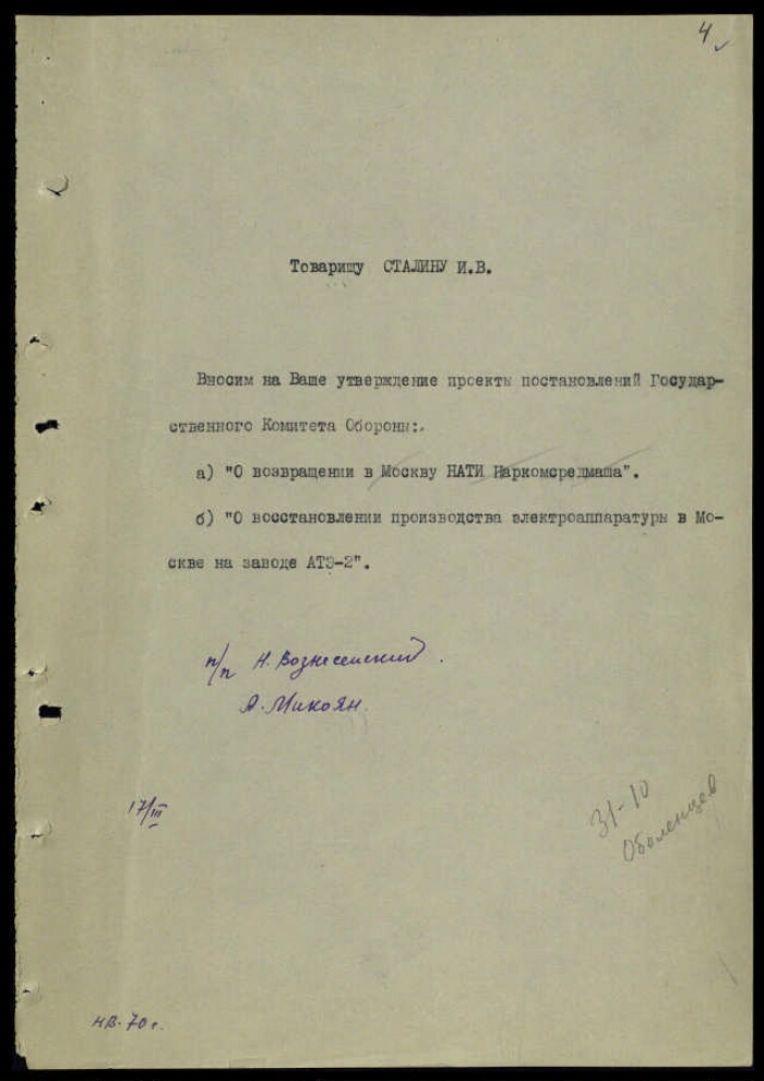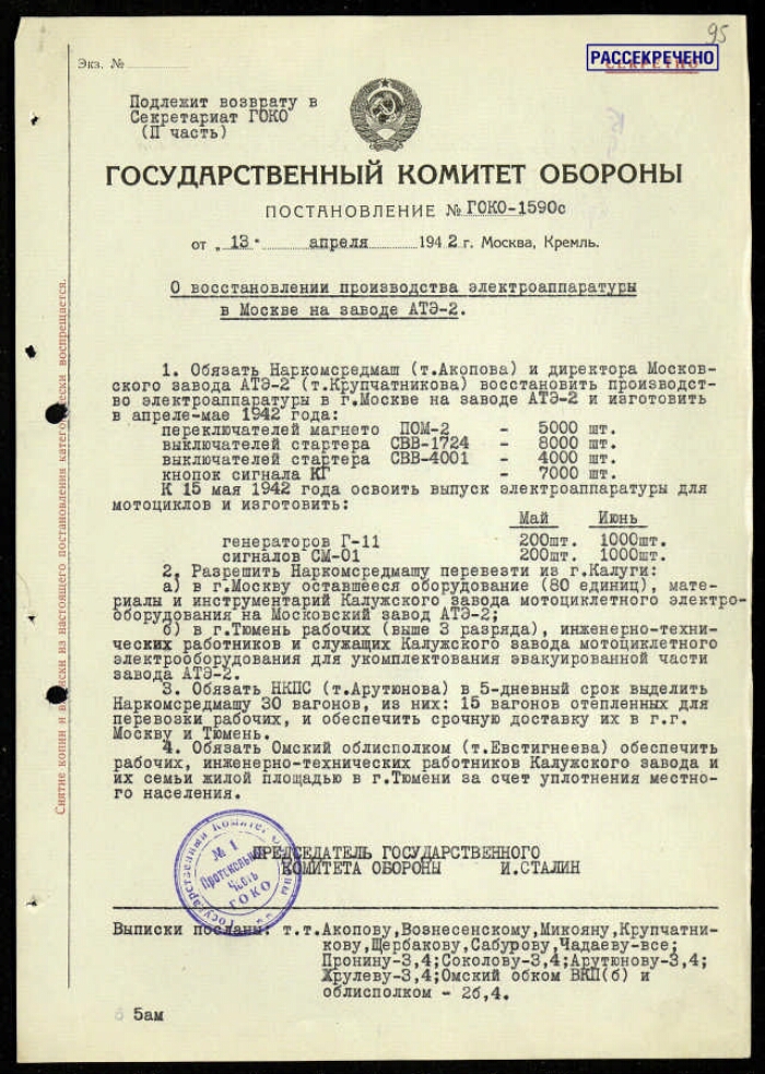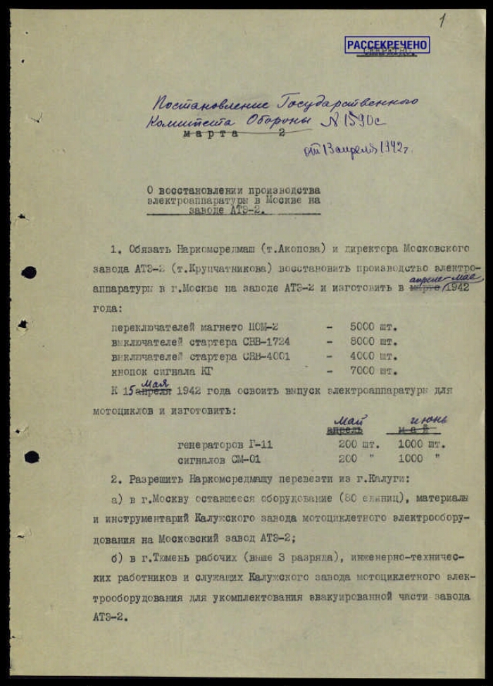 | Заголовок | Постановление ГКО СССР № 1590 с о восстановлении производства электроаппаратуры в Москве на заводе АТЭ-2, с приложением записки Вознесенского Н. А., Микояна А. И. Сталину И. В. и перечня вопросов, вынесенных на утверждение Сталина И. В. |