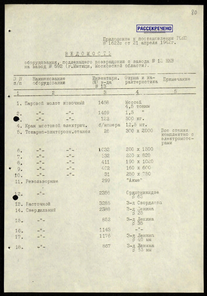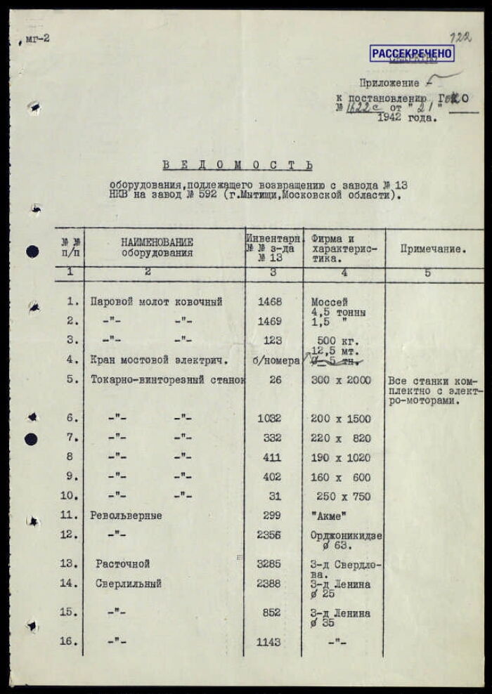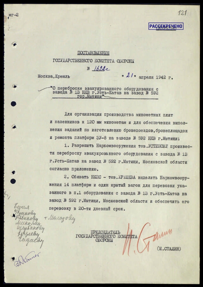| Заголовок | Постановление ГКО СССР № 1622 с о переброске эвакуированного оборудования с завода № 13 Наркомата вооружения г. Усть-Катав на завод № 592 г. Мытищи, с приложением записки Берии Л. П., Рябикова В. М. Сталину И. В. |