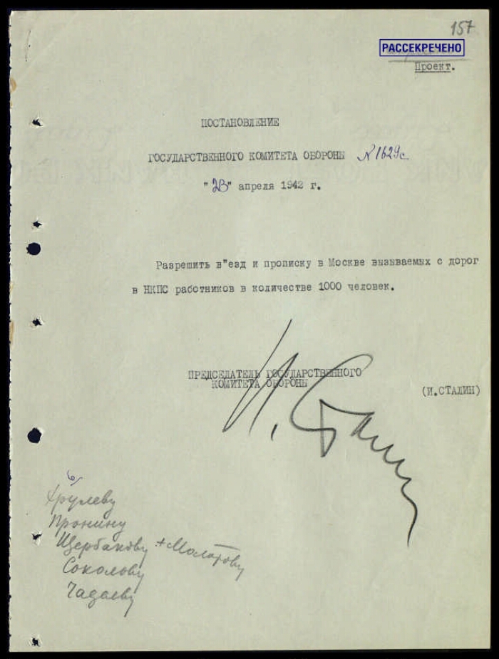Постановление ГКО СССР № 1629 с о разрешении въезда и прописки в Москве работников Наркомата путей сообщения, вызываемых с желез...