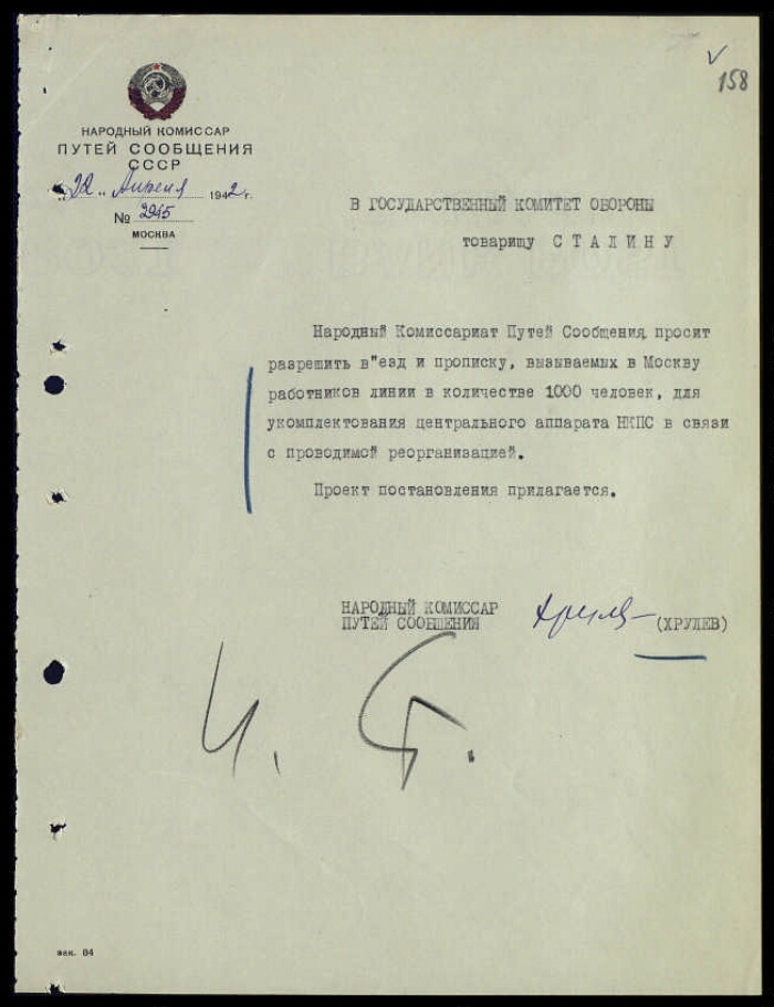 Заголовок Постановление ГКО СССР № 1629 с о разрешении въезда и прописки в Москве работников Наркомата путей сообщения, вызываемых с железных дорог, с приложением записки Хрулева А. В. Сталину И. В.