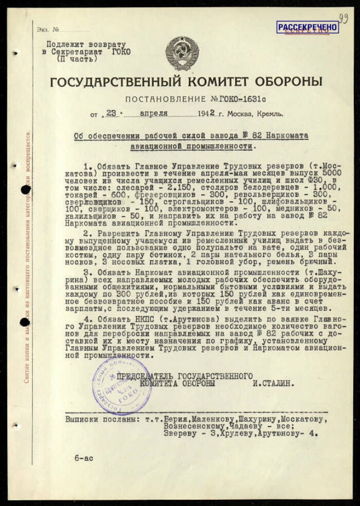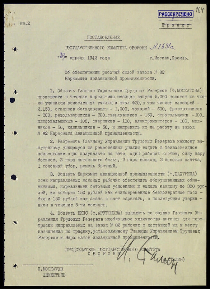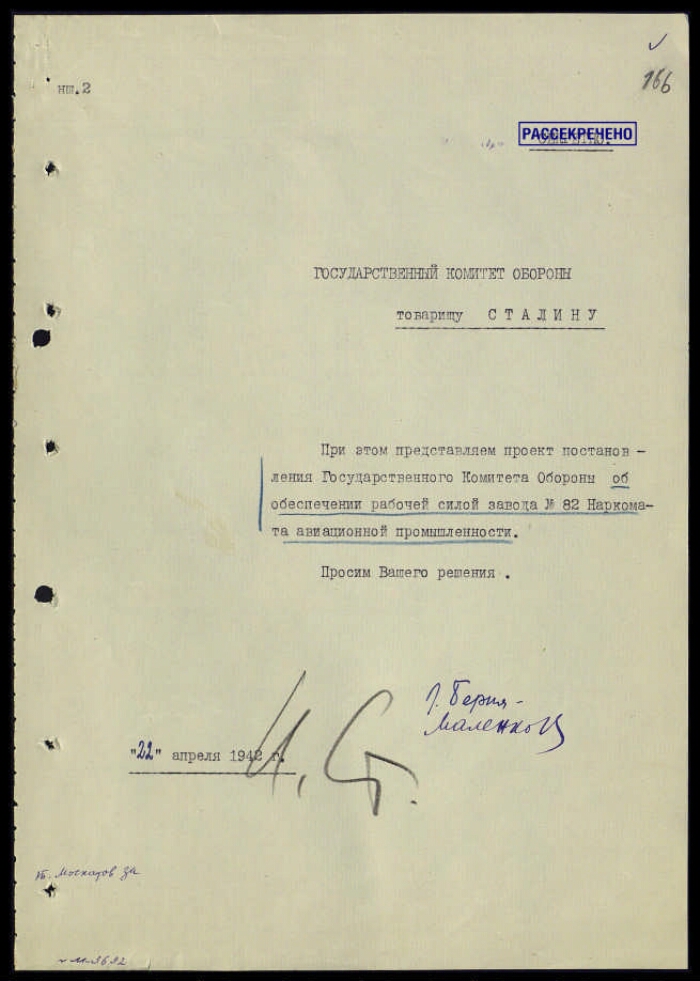 | Заголовок | Постановление ГКО СССР № 1631 с об обеспечении рабочей силой завода № 82 Наркомата авиационной промышленности, с приложением записки Берии Л. П., Маленкова Г. М. Сталину И. В. |