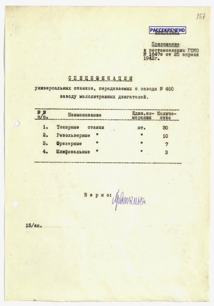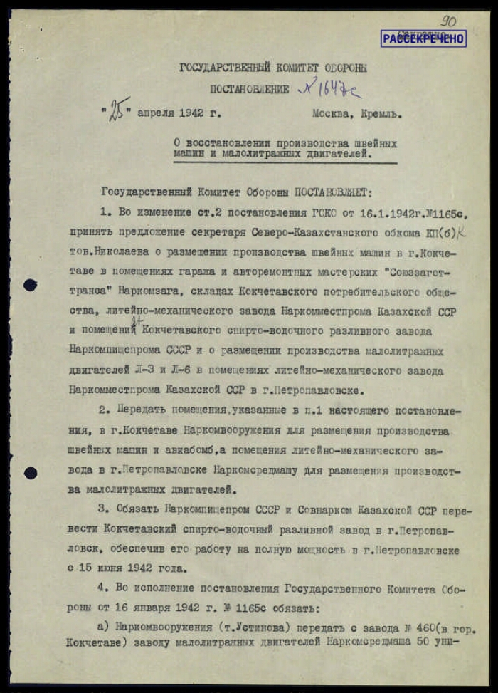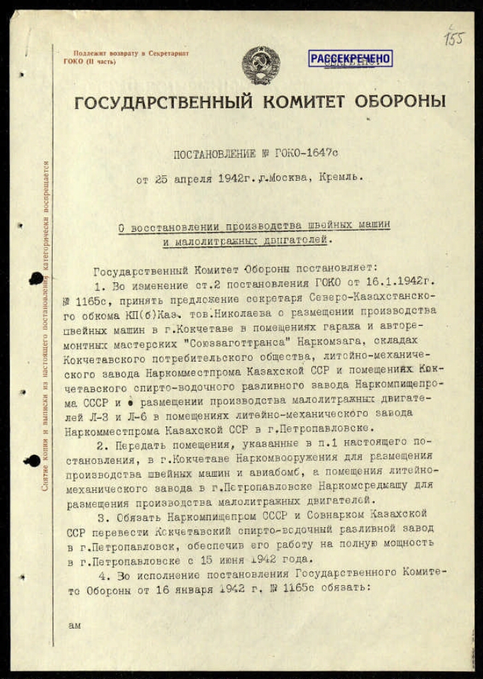 | Заголовок | Постановление ГКО СССР № 1647 с о восстановлении производства швейных машин и малолитражных двигателей, с приложением записки Молотова В. М., Вознесенского Н. А. Сталину И. В. и перечня вопросов, вынесенных на утверждение Сталина И. В. |