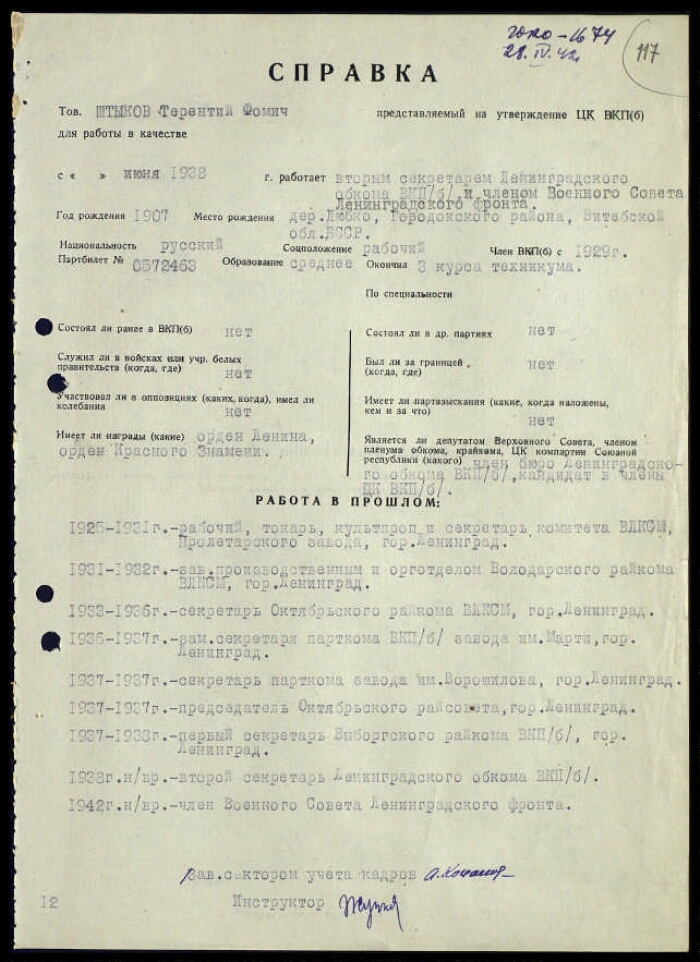 | Заголовок | Постановление ГКО СССР № 1674 о введении Штыкова Т. Ф. в состав Военного совета Ленинградского фронта, с приложением записки Кузнецова Ф. Ф. Сталину И. В., шифротелеграммы Жданова А. А., Кузнецова А. А., Гусева Д. Н., Соловьева Н. В. Сталину И. В. и справки-объективки |