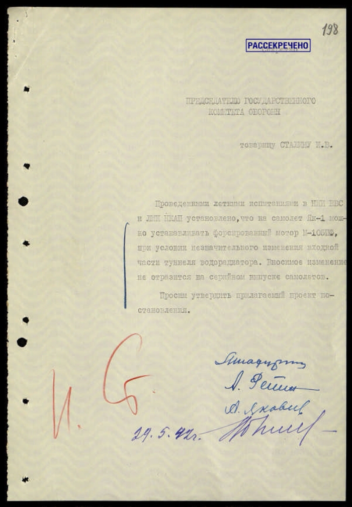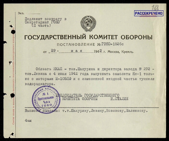 Заголовок | Постановление ГКО СССР № 1826 с о выпуске самолетов Як-1 с моторами М-105 ПФ, с приложением записки Шахурина А. И., Репина А. К., Яковлева А. С., Новикова А. А. Сталину И. В. |
