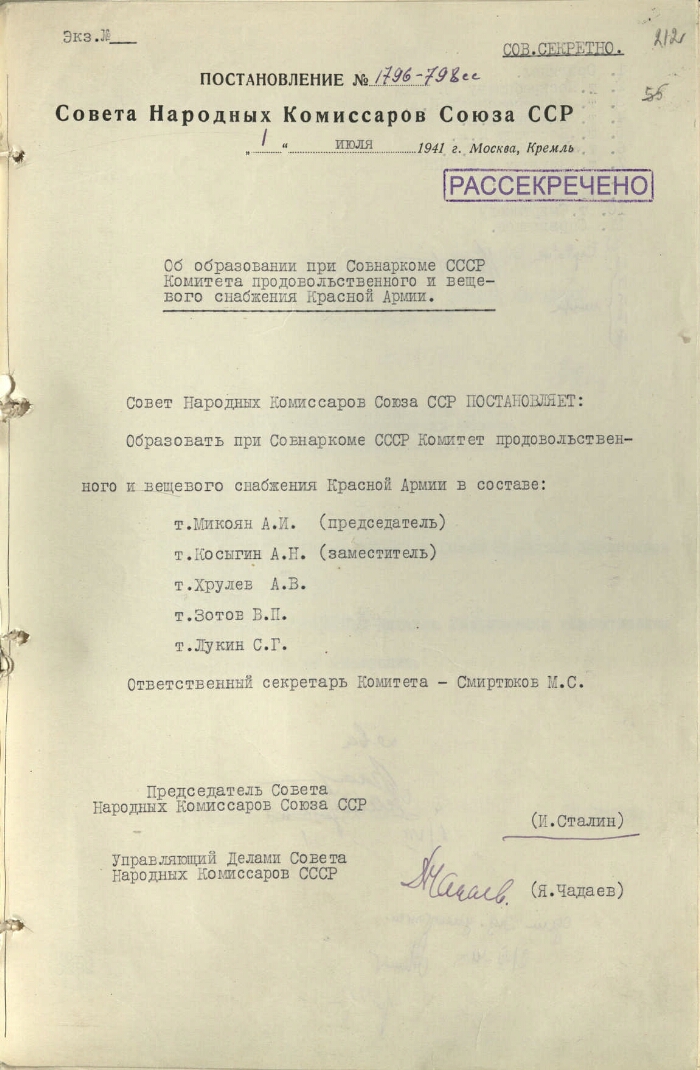 | Заголовок | Постановление СНК СССР № 1796-798сс "Об образовании при Совнаркоме СССР Комитета продовольственного и вещевого снабжения Красной армии" |