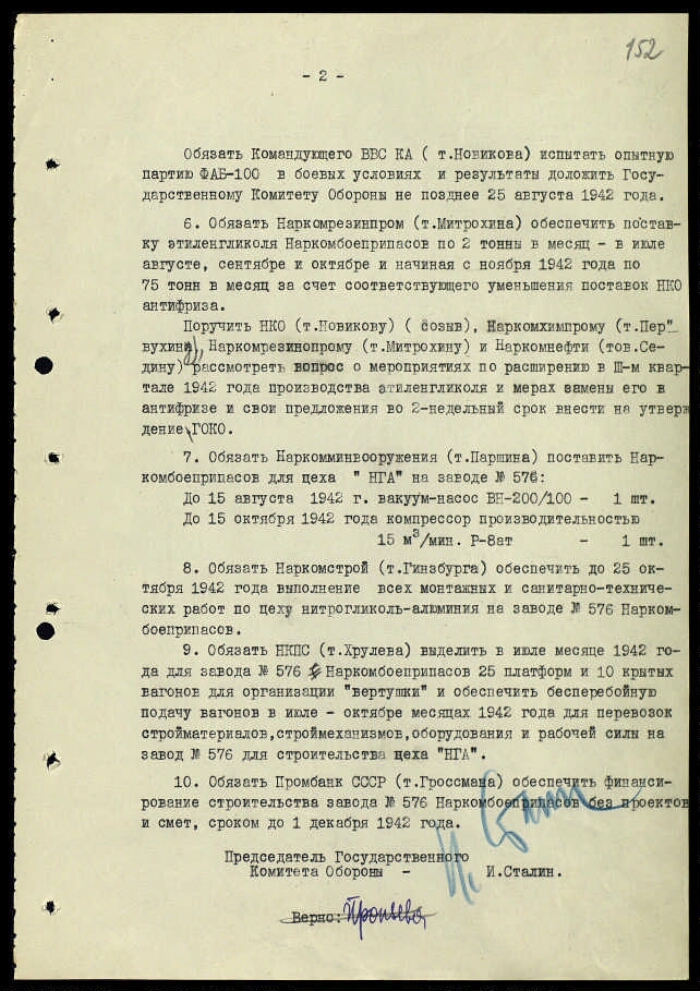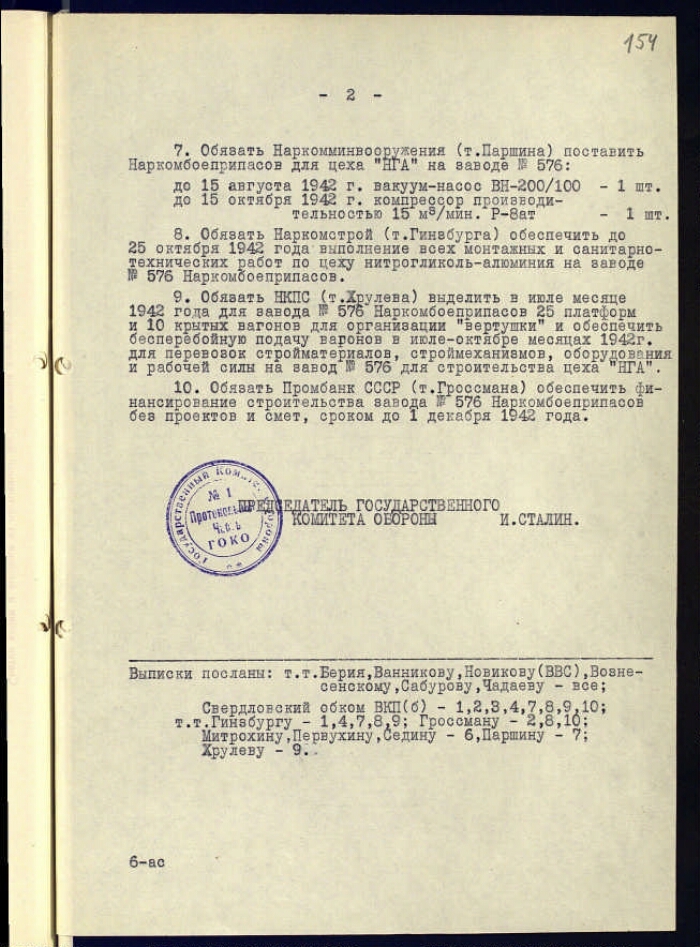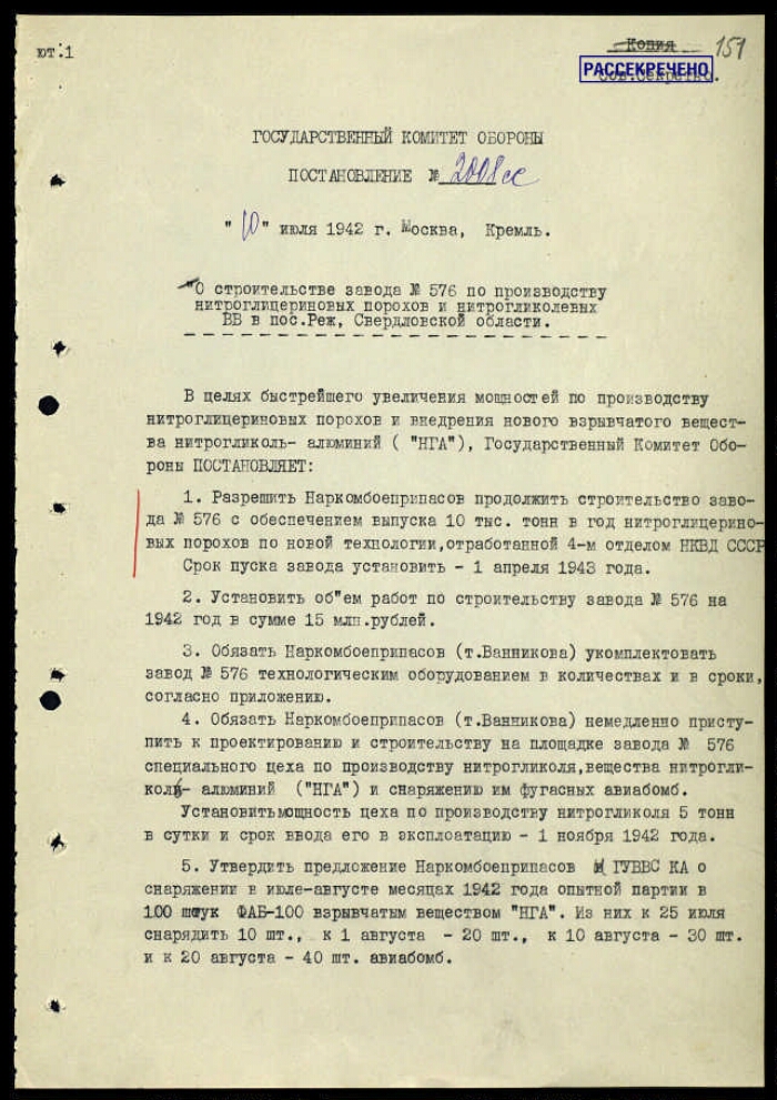 | Заголовок | Постановление ГКО СССР № 2008 сс о строительстве завода № 576 по производству нитроглицериновых порохов и нитрогликолевых ВВ в п. Реж Свердловской области, с приложением записки Берии Л. П., Ванникова Б. Л. Сталину И. В. |
