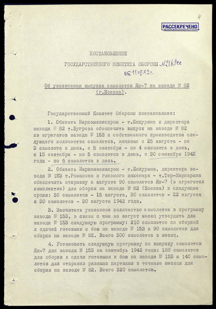 Постановление ГКО СССР № 2169 сс об увеличении выпуска самолетов Як-7 на заводе № 82 (г. Москва), с приложением записки Маленков...