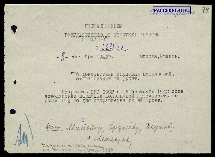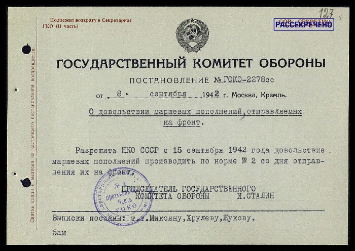 Постановление ГКО СССР № 2278 сс о довольствии маршевых пополнений, отправляемых на фронт, с приложением записки Микояна А. И., ...