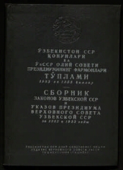 Сборник законов Узбекской ССР и указов Президиума Верховного Совета Узбекской ССР за 1952 и 1953 годы = Ўзбекистон ССР Конунлари ва ЎзССР ОЛИЙ Совети Президиумининг фармонлаои Тўплами 1952 ва 1953 йиллар. - Ташкент : Изд. Верховного Совета Узбекской ССР, 1954. -94, [1] с.. - Тит. л. и обл. парал. на узб. и рус. яз. Текст парал. на узб. и рус. яз. Экз.: с рукоп. помет.