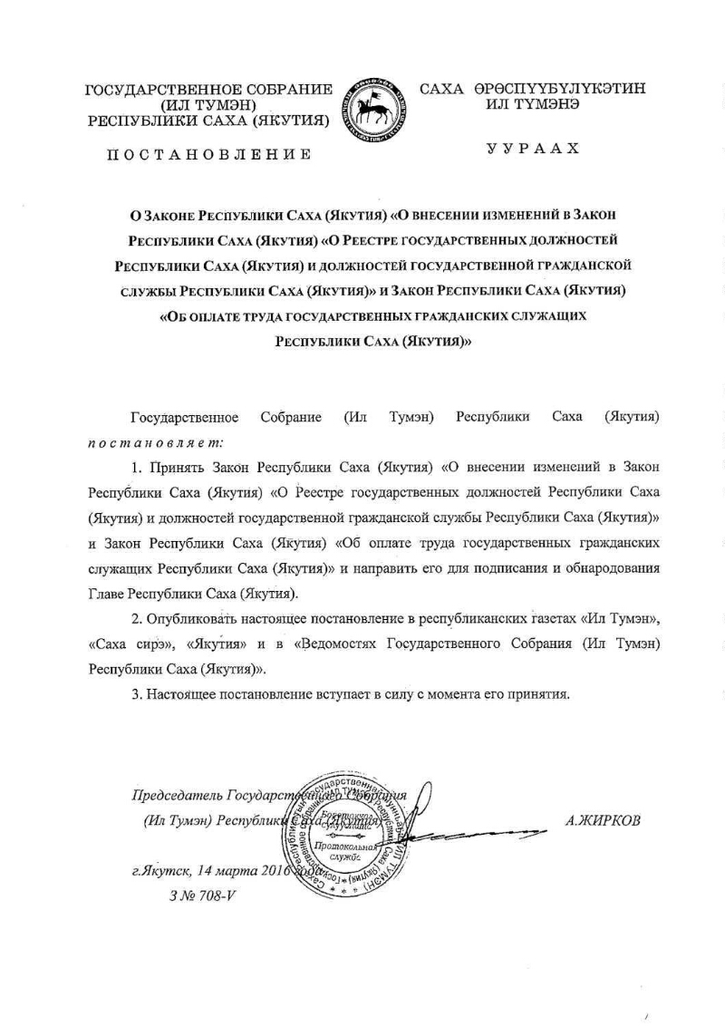 О внесении изменений в Закон Республики Саха (Якутия) “О Реестре государственных должностей Республики Саха (Якутия) и должностей государственной гражданской службы Республики Саха (Якутия)” и Закон Республики Саха (Якутия) “Об оплате труда государственных гражданских служащих Республики Саха (Якутия)” : Закон Республики Саха (Якутия) от 14.03.2016 1569-З № 707-V. - Электронные текстовые данные (4 файла). -(Москва: ГлавНИВЦ УДП РФ , 2018). - Режим доступа: интернет-портал Президентской библиотеки. Загл. с титульной страницы. Электронная версия:Закон Республики Саха (Якутия) от 14.03.2016 1569-З № 707-V "О внесении изменений в Закон Республики Саха (Якутия) “О Реестре государственных должностей Республики Саха (Якутия) и должностей государственной гражданской службы Республики Саха (Якутия)” и Закон Республики Саха (Якутия) “Об оплате труда государственных гражданских служащих Республики Саха (Якутия)”".