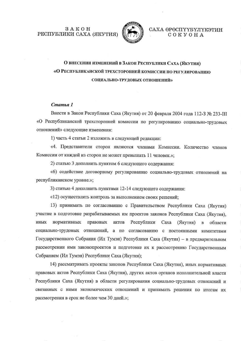 О внесении изменений в Закон Республики Саха (Якутия) “О Республиканской трехсторонней комиссии по регулированию социально-трудовых отношений” : Закон Республики Саха (Якутия) от 26.10.2016 1731-З № 1019-V. - Электронные текстовые данные (4 файла). -(Москва: ГлавНИВЦ УДП РФ , 2018). - Режим доступа: интернет-портал Президентской библиотеки. Загл. с титульной страницы. Электронная версия:Закон Республики Саха (Якутия) от 26.10.2016 1731-З № 1019-V "О внесении изменений в Закон Республики Саха (Якутия) “О Республиканской трехсторонней комиссии по регулированию социально-трудовых отношений”".