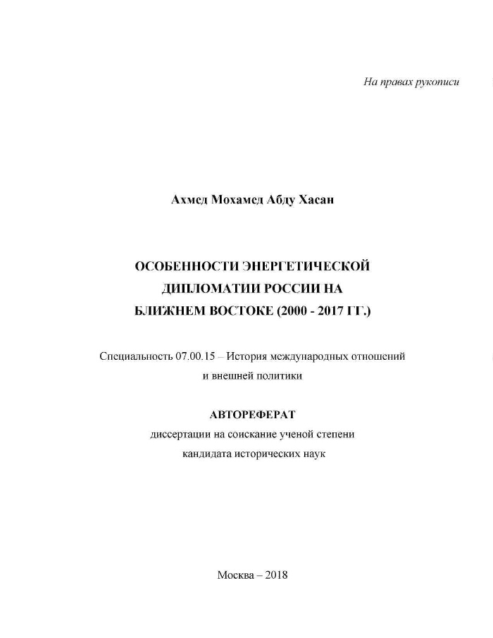 Особенности энергетической дипломатии России на Ближнем Востоке (2000-2017 гг.) : автореферат диссертации на соискание ученой степени кандидата исторических наук : специальность 07.00.15 / Ахмед Мохамед Абду Хасан ; [Место защиты: Рос. ун-т дружбы народов]. - Москва, 2018. -27 с. ; 21 см.. - Библиогр.: с. 27-28 (5 назв.) и в подстроч. примеч.. - Рез. на англ. яз.