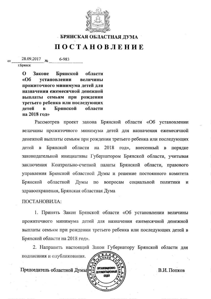 Об установлении величины прожиточного минимума детей для назначения ежемесячной денежной выплаты семьям при рождении третьего ребёнка или последующих детей в Брянской области на 2018 год : Закон Брянской области от 2 октября 2017 года № 79-З : принят Брянской областной Думой 28 сентября 2017 года ; О Законе Брянской области "Об установлении величины прожиточного минимума детей для назначения ежемесячной денежной выплаты семьям при рождении третьего ребёнка или последующих детей в Брянской области на 2018 год" : Постановление Брянской областной Думы от 28 сентября 2017 года № 6-983. - Брянск, 2017. -1, 1 лист. - Место и даты подписания документов: г. Брянск, 2 октября, 28 сентября 2017 года. Электронные версии правых актов (2 файла, JPEG : 1,4 МБ). Опубликованы в издании: Официальный интернет-портал правовой информации (www.pravo.gov.ru) от 05.10.2017 г. (№ 3200201710050008).